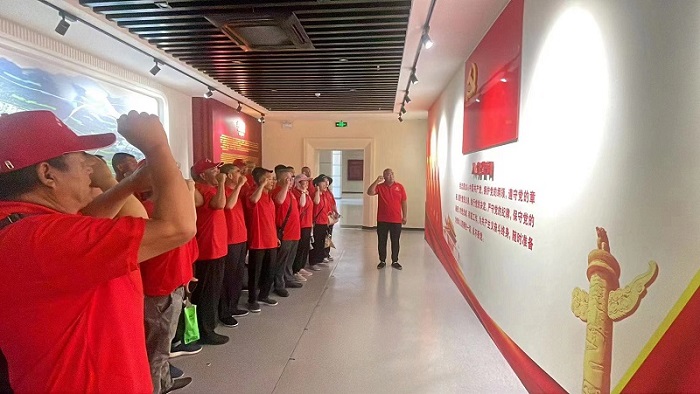 在紀(jì)念館內(nèi),黨員們面對(duì)鮮紅的黨旗,一起高舉右手,再次重溫入黨誓詞,鏗鏘恢宏的誓詞,使每一位黨員再次接受了心靈洗禮,銘記莊嚴(yán)承諾,牢記共產(chǎn)黨員的責(zé)任擔(dān)當(dāng)和光榮使命。